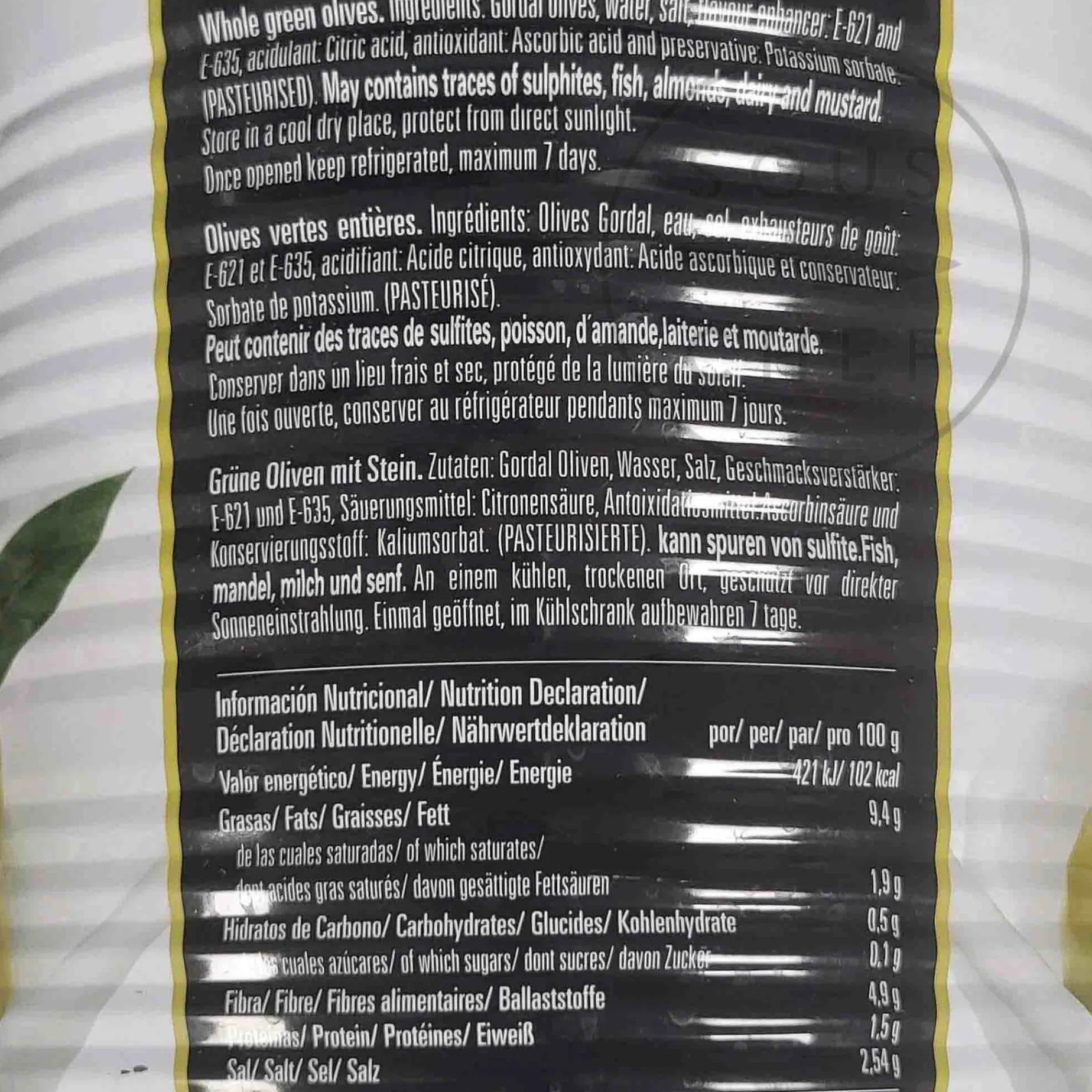 Product formulations and details may change. For the latest ingredients and allergen information always check product packaging prior to consumption. Ingredients: Gordal olives, water, salt, flavour enhancer: e621 and e-635, acidulant: citric acid, antioxidant: ascorbic acid and preservative: potassium sorbate (pasteurised)