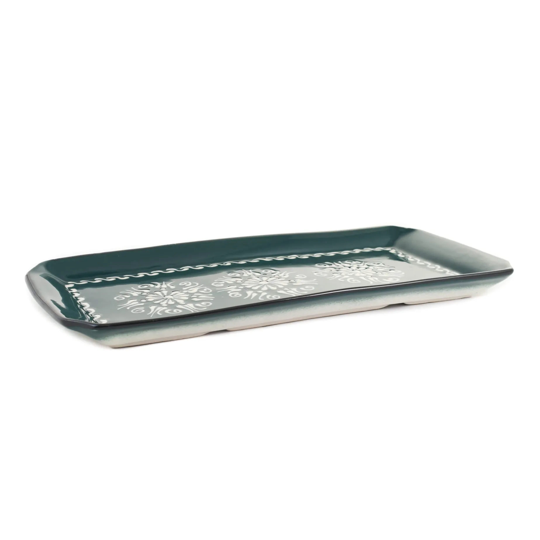 The rectangular tray features an intricate design on a deep green background. Pair it with other green and white crockery for a colourful tablescape.